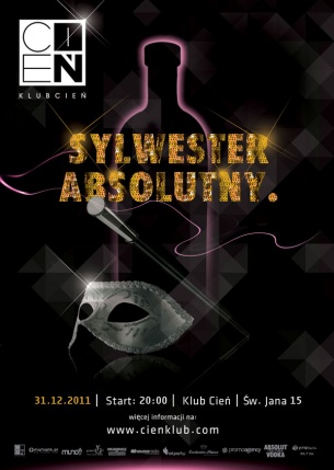 Klub Cień organizuje absolutne pożegnanie roku 2011 w najbardziej klubowym klimacie. Nie dla Ciebie wykwintne bale, mówisz nie weselnym przebojom to musisz wybrać się na absolutnie dobrą imprezę. W klubie Cień czekać na Ciebie będzie wyjątkowa i niepowtarzalna atmosfera, absolutnie dobra zabawa i absolutnie taneczna muzyka serwowana przez klubowych rezydentów. Klubowe hity mijającego roku zagrają DOLBY S. IAN, DEAS, FLASH i  CHAJT. Sylwester Absolutny proponuje dwa parkiety taneczne i trzy bary z pełną ofertą różnorodnych alkoholi dla swoich gości.