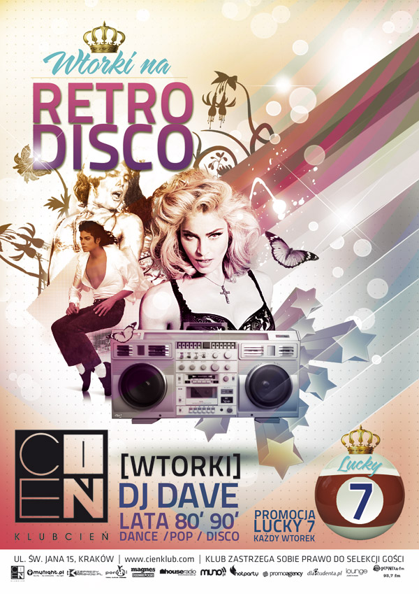 Najbardziej taneczna impreza w mieście teraz w stylu retro! W każdy wtorek w klubie Cień przenosimy się w czasie podczas naszej cyklicznej imprezy w klimacie disco. O nieskrępowaną imprezową atmosferę zadba wszechstronny DJ DAVE, który zaserwuje kultowe kawałki lat 80. i 90-tych z gatunków pop, dance, disco i znacznie więcej…. To szerokie spektrum muzyczne z całą pewnością  każdemu przypadnie do gustu. Retro Disco to prostu super zabawa, niezapomniane przeboje oraz unikalny klimat.