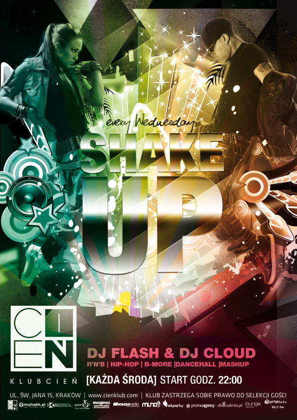 SHAKE UP czyli wstrząsająca środowa impreza w Cieniu. Rusz się i nie siedź w domu bo nadmierne przesiadywanie grozi otyłością, wiotkością mięśni i zacofaniem w życiu towarzyskim. Wrzuć na luz i w środku tygodnia wskocz w wygodne ciuchy aby potrząsać się na parkiecie w rytm najlepszych utworów z gatunku r’n’b, hip-hop, b-more oraz mash-up. Za muzyczne zatrzęsienie odpowiedzialny będzie DJ FLASH oraz DJ CLOUD.